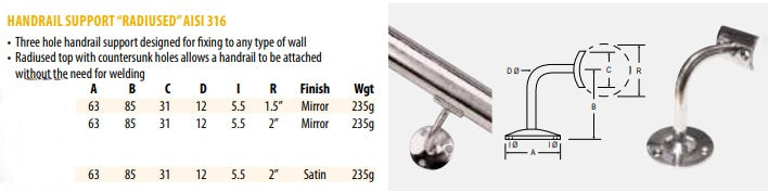 HandRail Support to Suit Round Tube 2 Inch 316 Grade Satin Finish